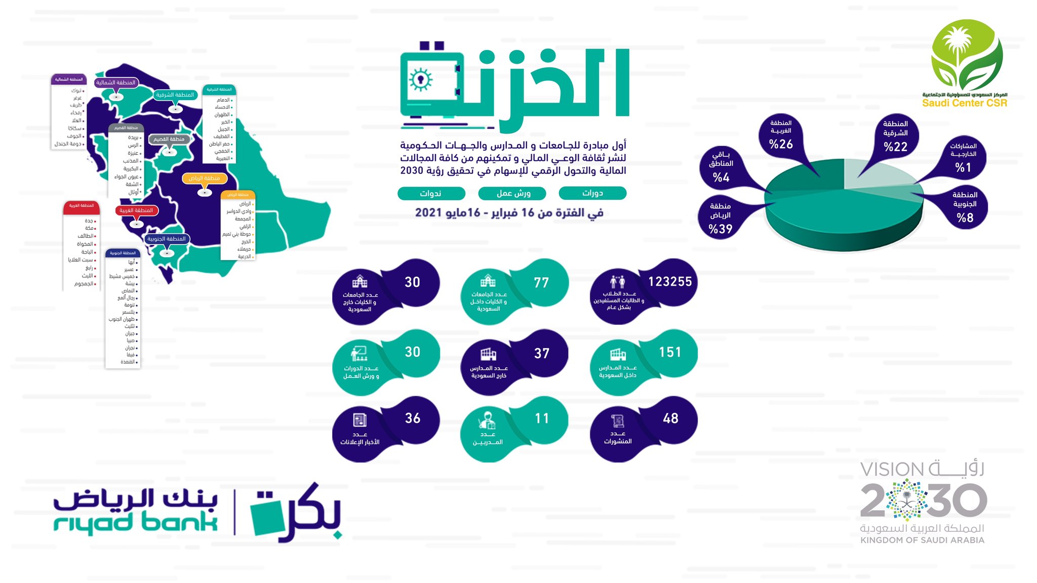 وتأتي هذه الشراكة ضمن استراتيجية بنك الرياض للمسؤولية الاجتماعية ” بُكرة ” التي تهدف إلى تقديم ممارسات ذات قيم ومزايا تتماشى مع رؤية “السعودية 2030″، وأهداف الأمم المتحدة للتنمية المستدامة. وإيمانًا منه بأهمية توعية وتثقيف المجتمع فيما يخص الأمور المالية ونشر ثقافة الادخار، وجعلها ثقافة مجتمع ومكونًا اجتماعيًا مهمًا، مما يسهم في تحقيق الأمان والاستقرار المالي للأسر والأفراد، ويساعد على رفع وتيرة الاستثمار والتنمية.الشراكة مع بنك الرياض، أطلق المركز السعودي للمسؤولية الاجتماعية مبادرة ” الخزنة “، والتي تهدف إلى نشر التوعية المالية والتحذير من اساليب الاحتيال المالي، ورفع الوعي بأهمية التحول الرقمي لنظام المدفوعات